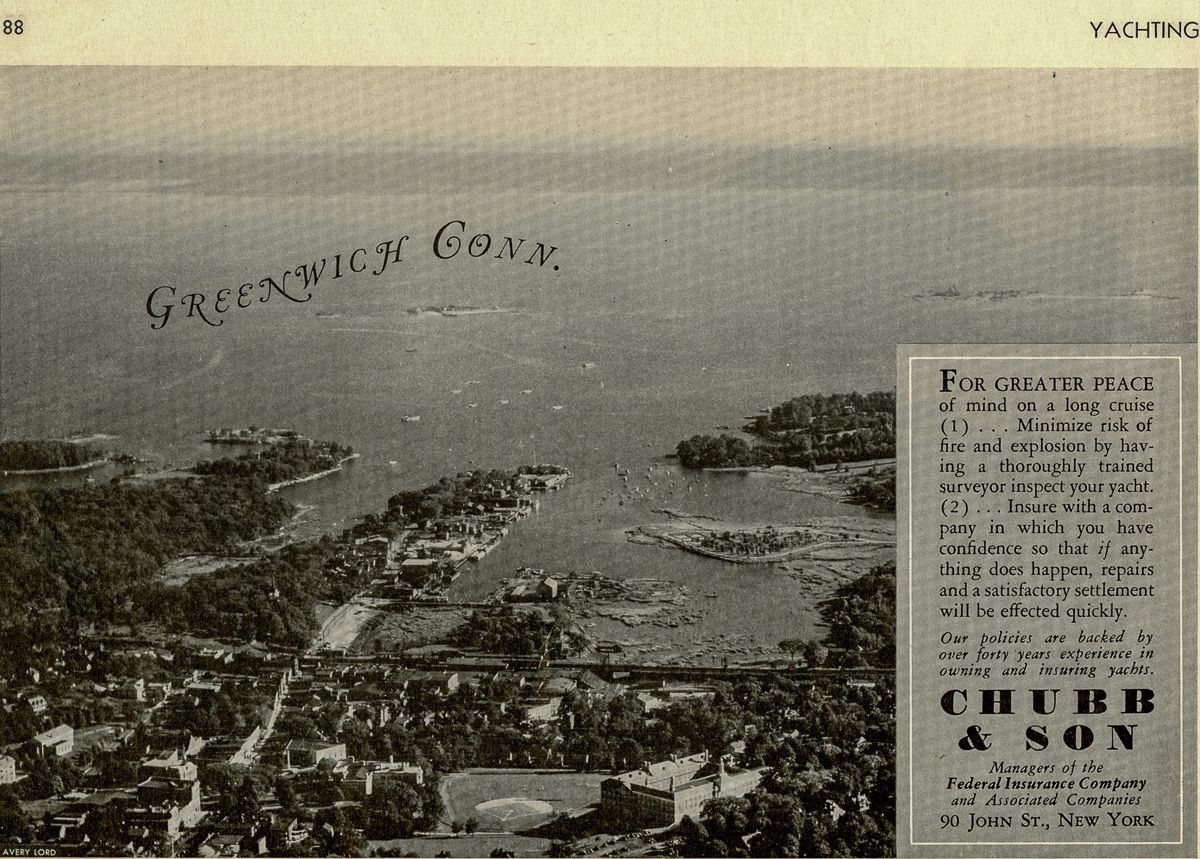 Advertisement with an aerial view facing south over Greenwich Avenue and Town Hall towards Long Island Sound and Greenwich Harbor.Collection