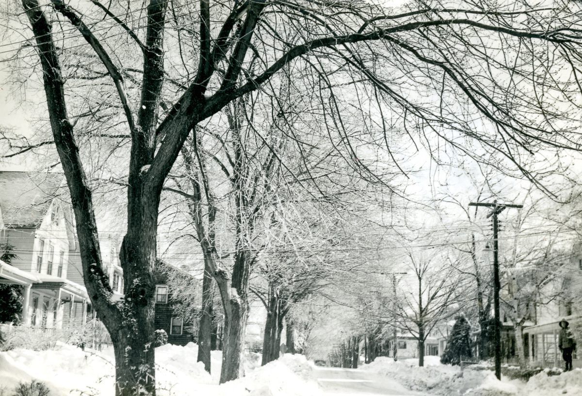 A street after a blizzard with a boy standing on a snow drift on the right side of the image.
