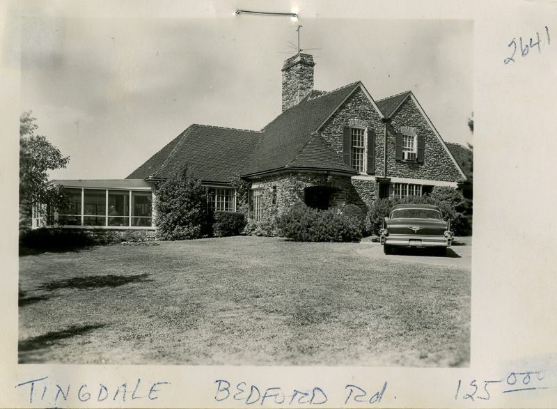 Stone house built in the early 1940's with a hip-and-valley roof, a screened in deck, and a car parked in front viewed from its driveway.Collection