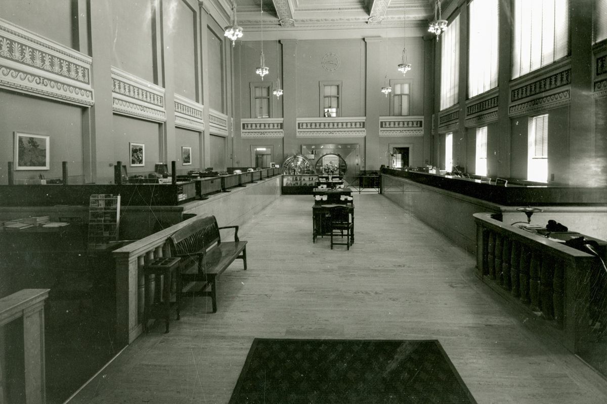 View of the interior of the Putnam Trust Company; the vault door is open at the end of the room.Collection