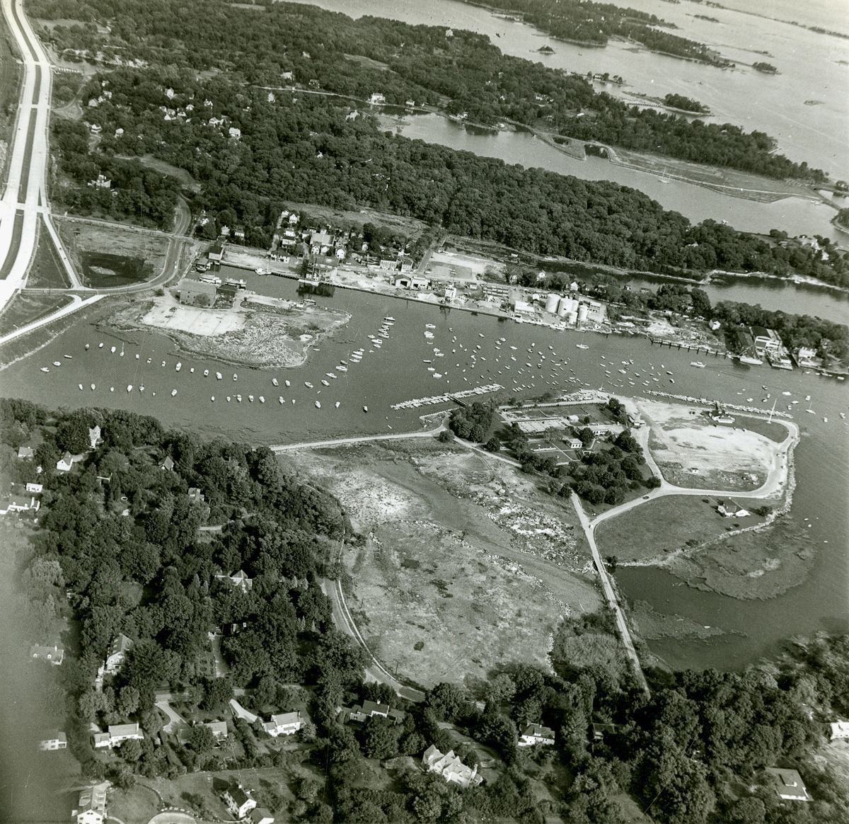 Aerial view of Greenwich Harbor and Grass Island looking east with Interstate 95 on the top left of the image.Collection