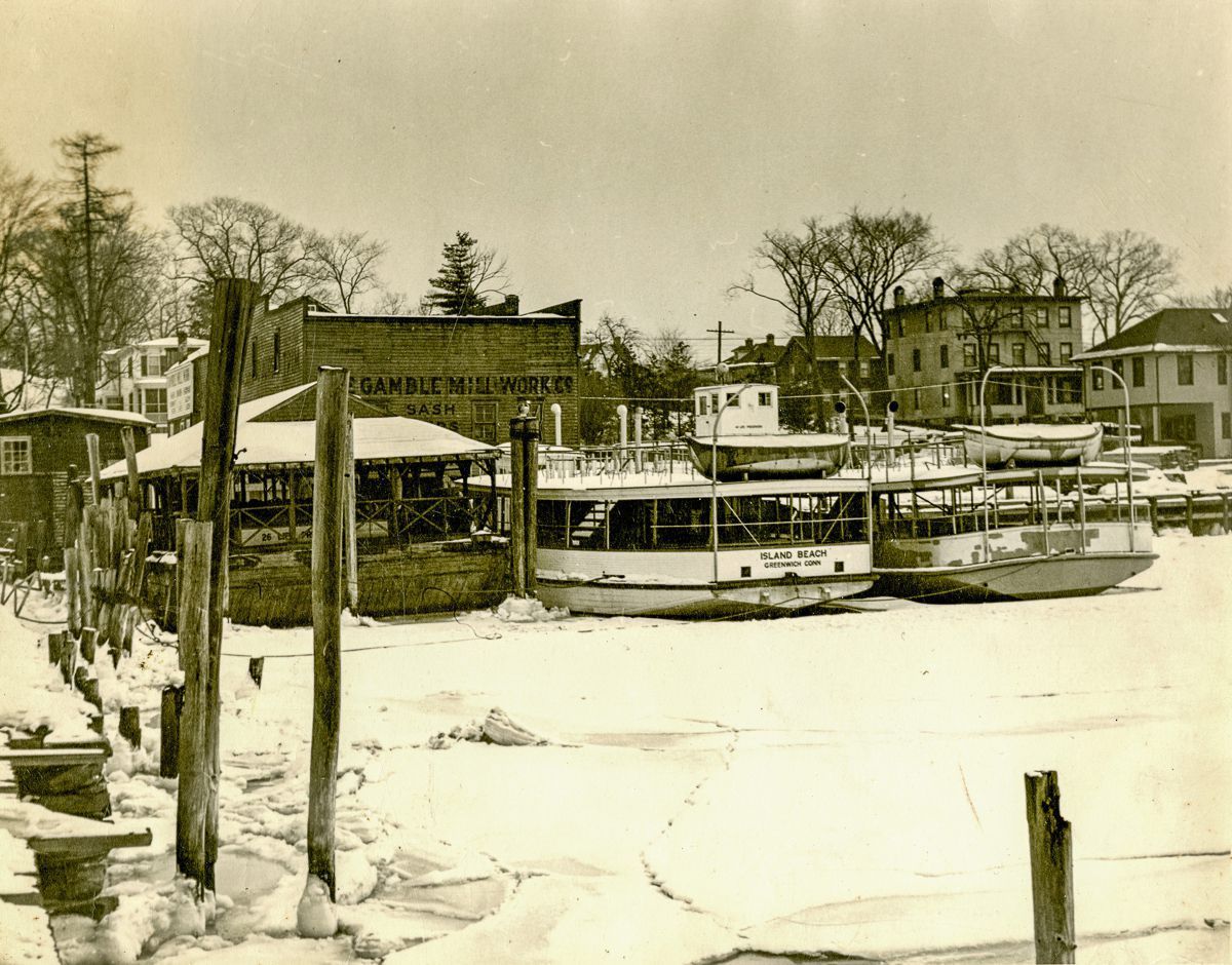 Island Beach Ferries in an iced-over Greenwich Harbor.