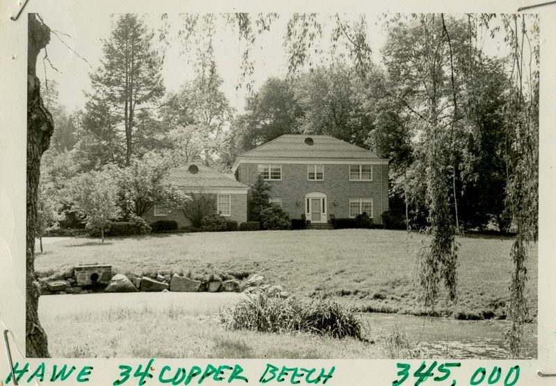 House built in 1963 with brick walls and a hip roof viewed from its lawn that has a stream running through it.Collection
