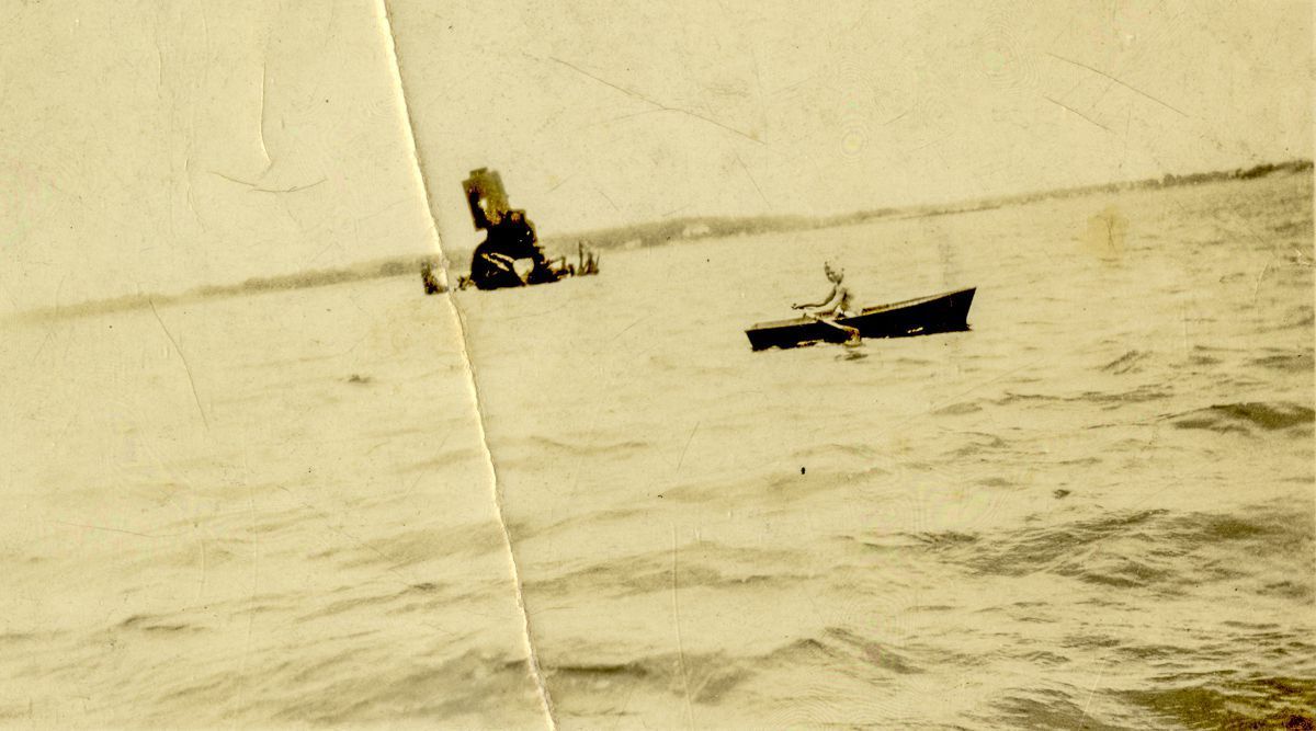 A boy named as Wesley Jr., sitting in a rowboat by a shipwreck.