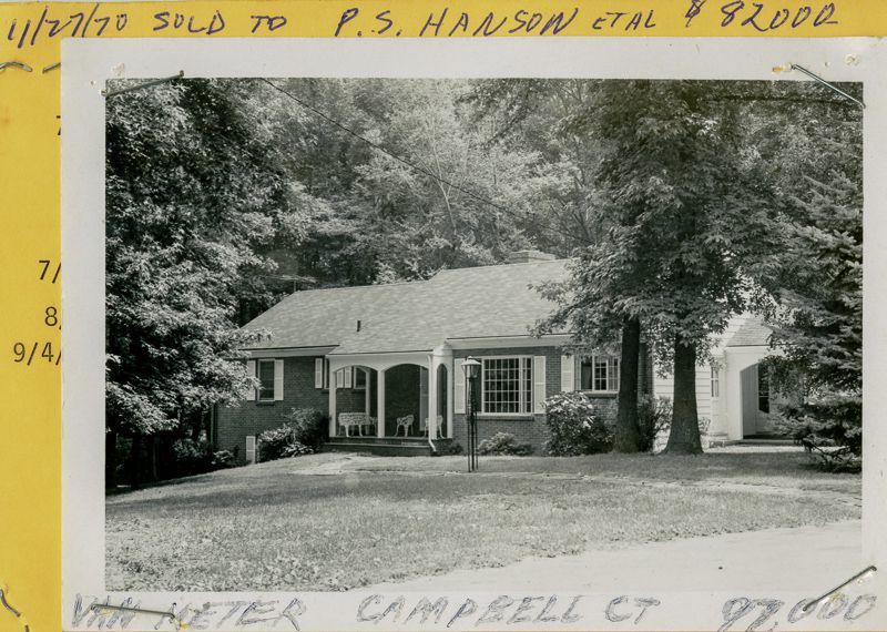 Colonial ranch house built in 1954 with brick walls viewed from its lawn.