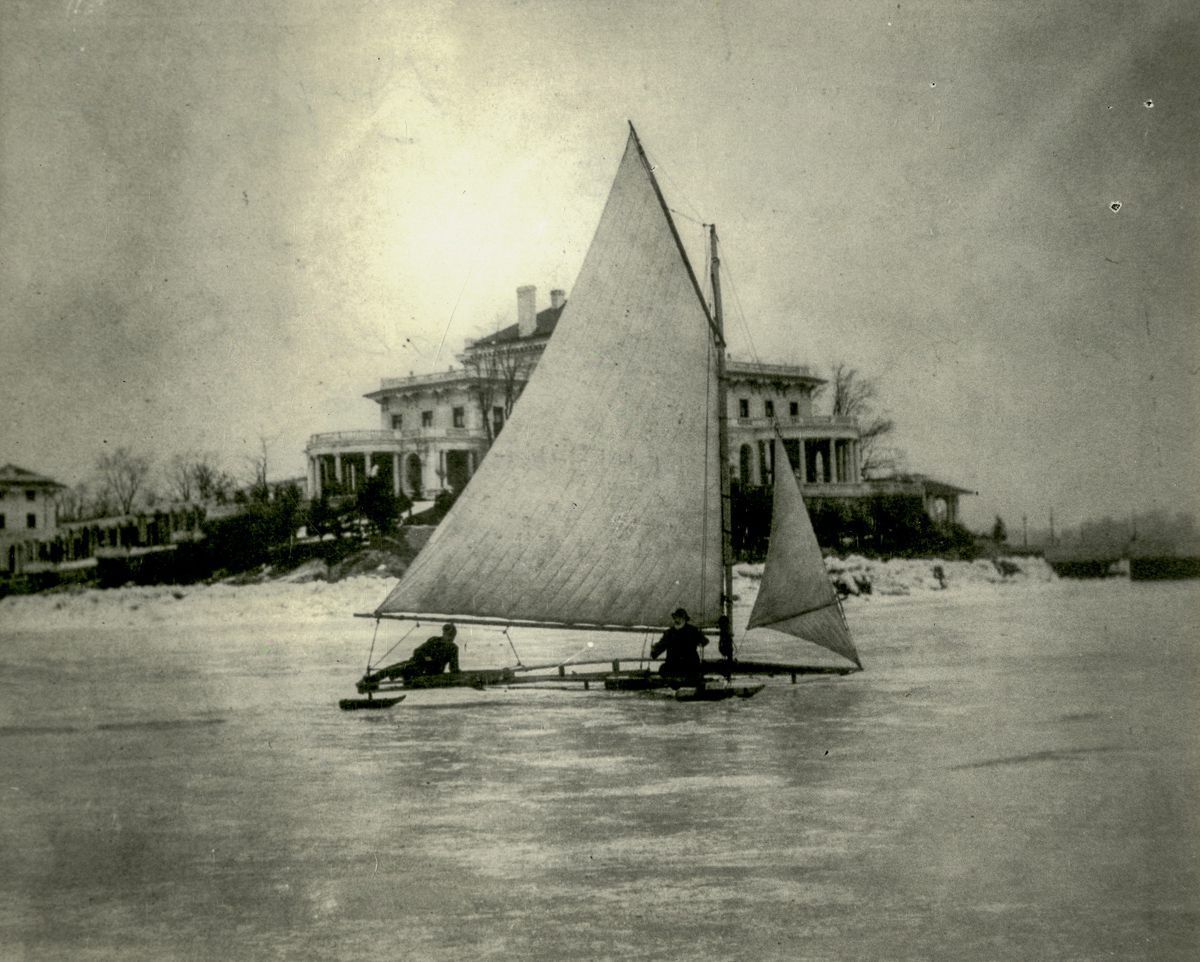 Two men on an ice boat on the frozen Greenwich Harbor; the Benedict mansion, now 66 Vista Drive can be seen in the background.Collection