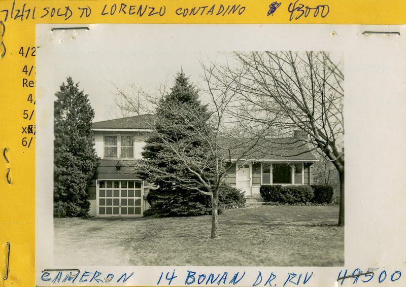 Split-level shingled house built in 1953 with a garage viewed from its lawn.