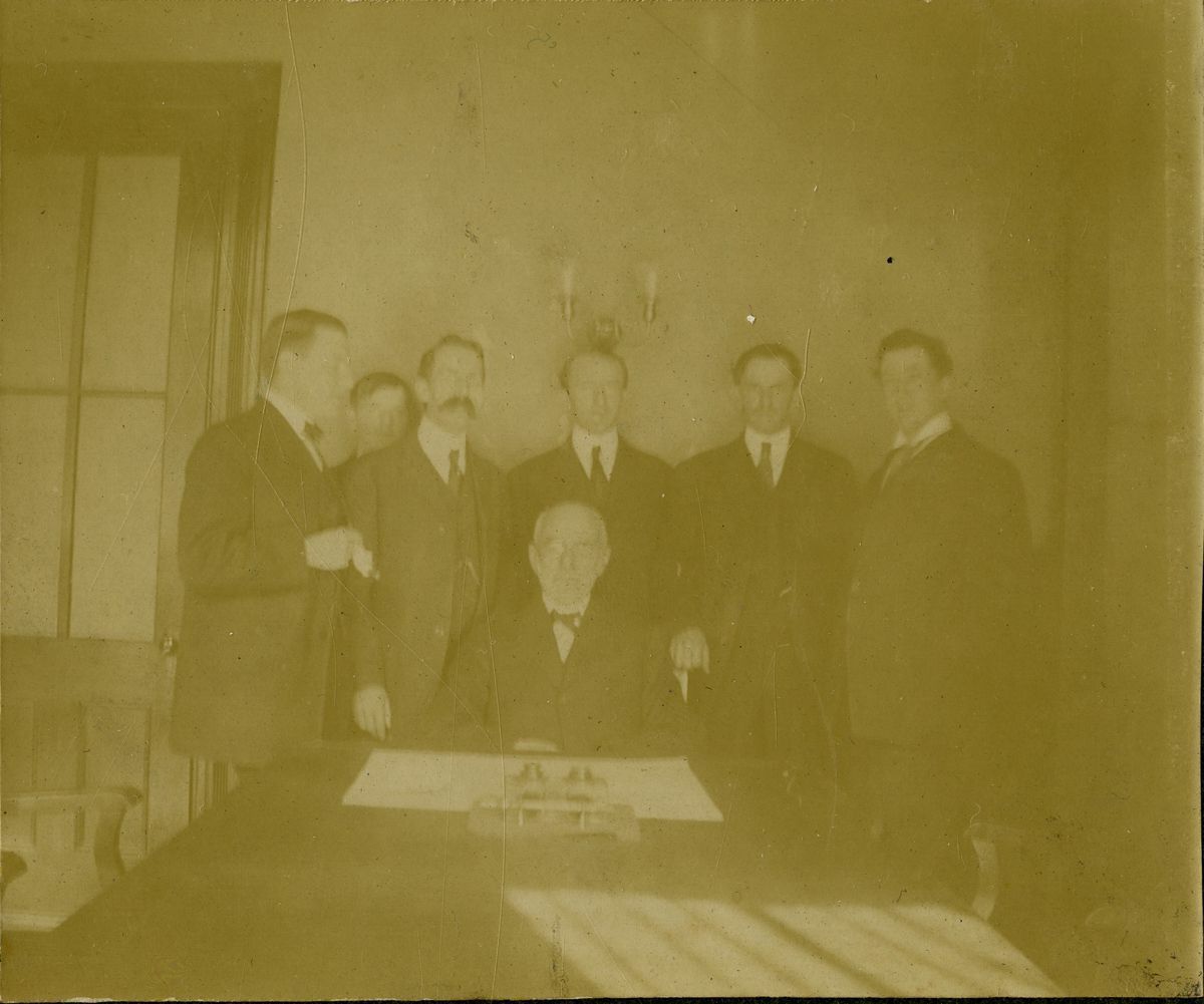 Alfred Rundle and six other men at a meeting of the Greenwich Trust Company.