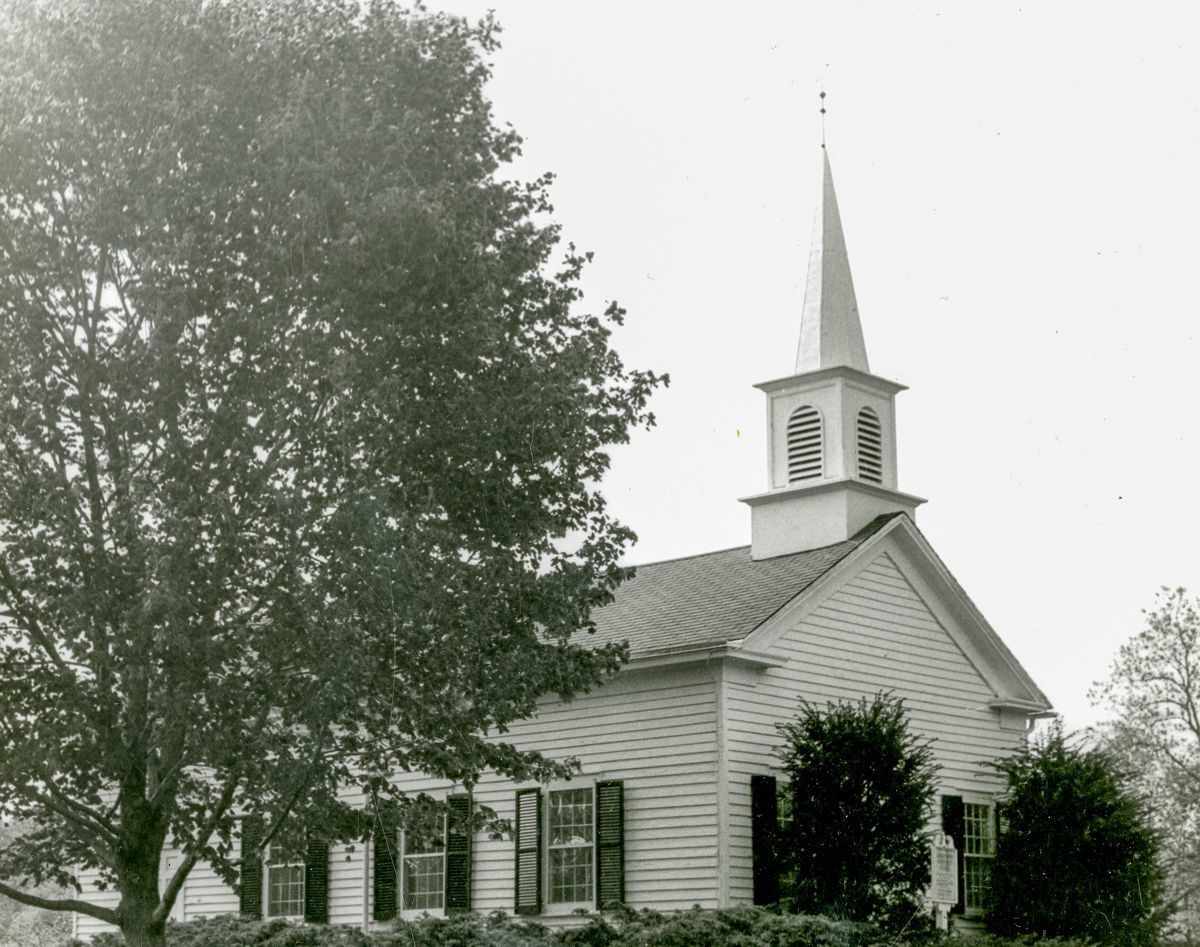 A view of the front face and south side of Dingletown Community Church and its steeple.