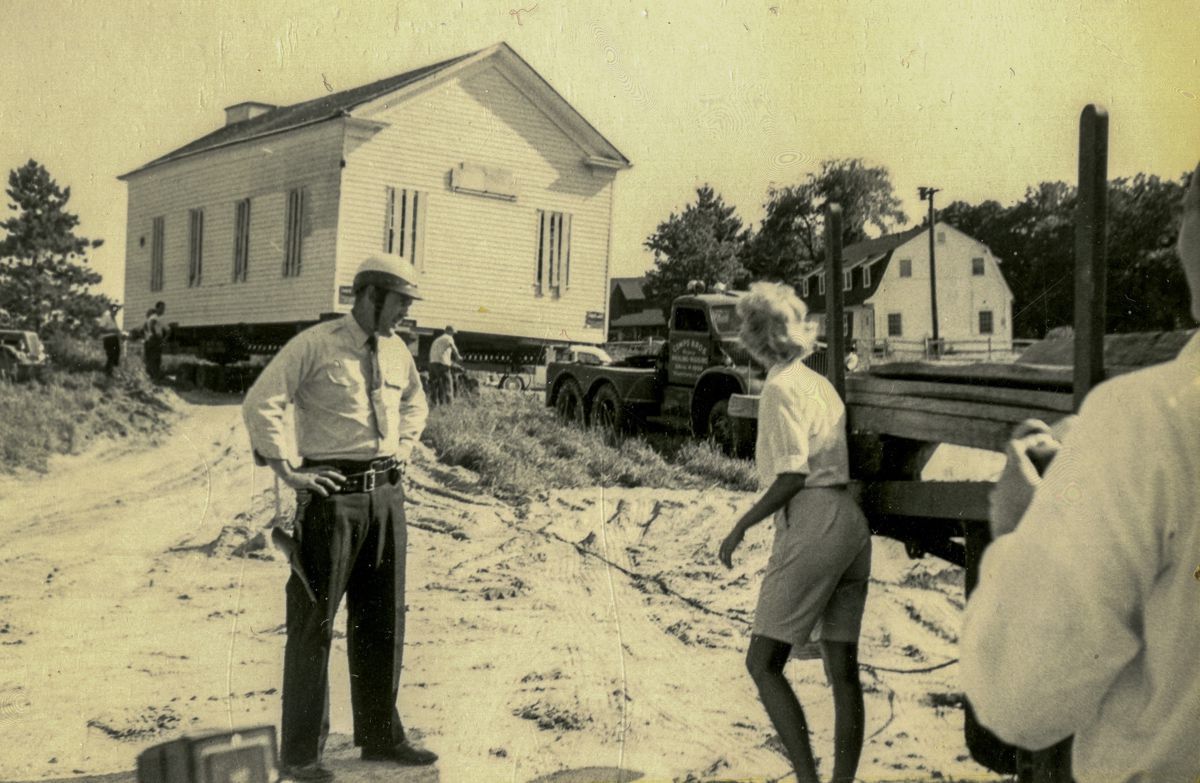 Images of the moving of Dingletown Community Church to its new site on August 13, 1959.