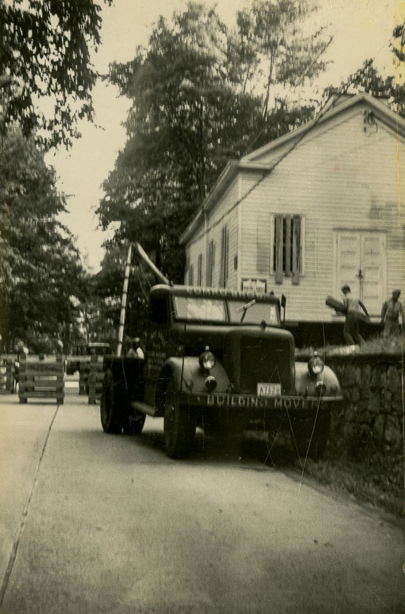 Images of the moving of Dingletown Community Church to its new site on August 13, 1959.