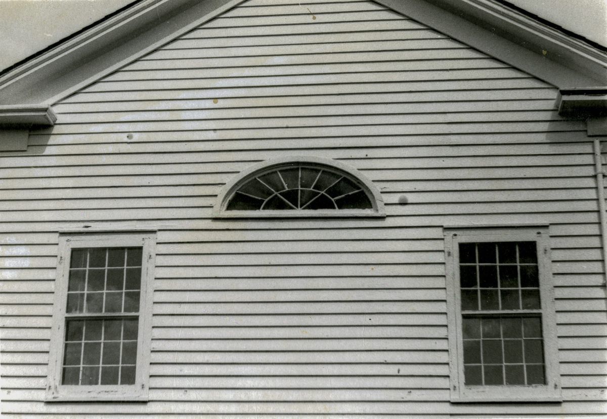 A close-up of three rear windows of Dingletown Community Church.