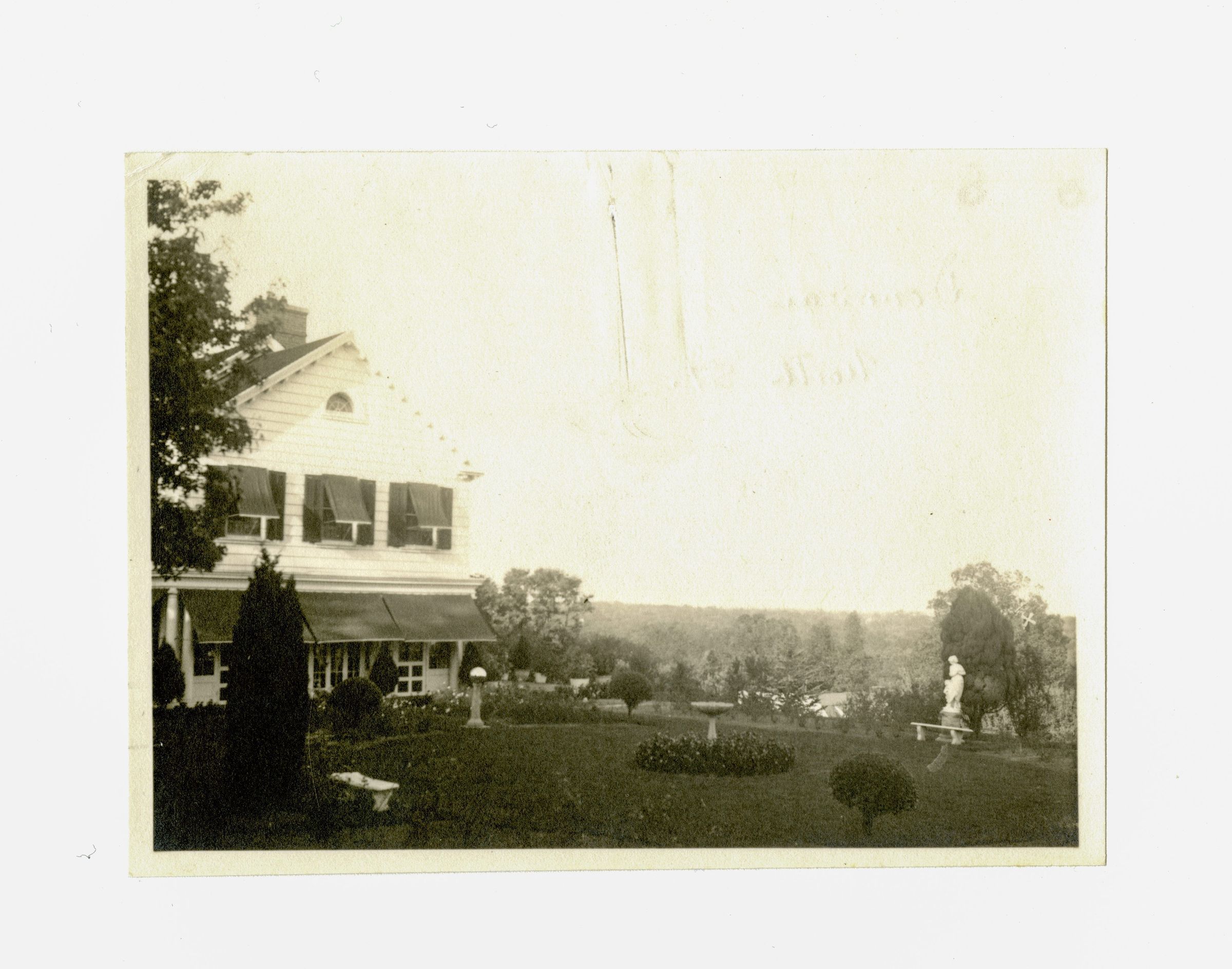 A view of the side of a three story house and its garden looking out towards a wooded area.