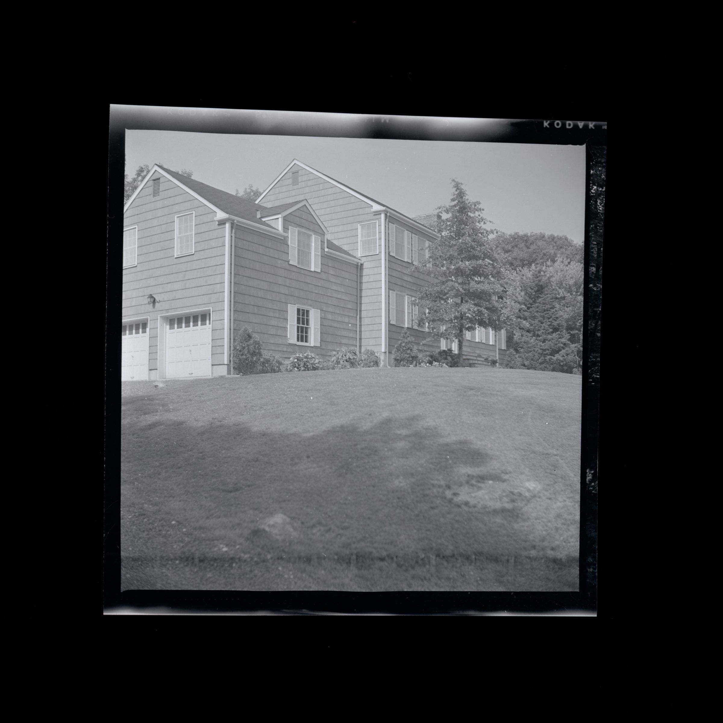 A shingle house with a two door garage viewed from its lawn.