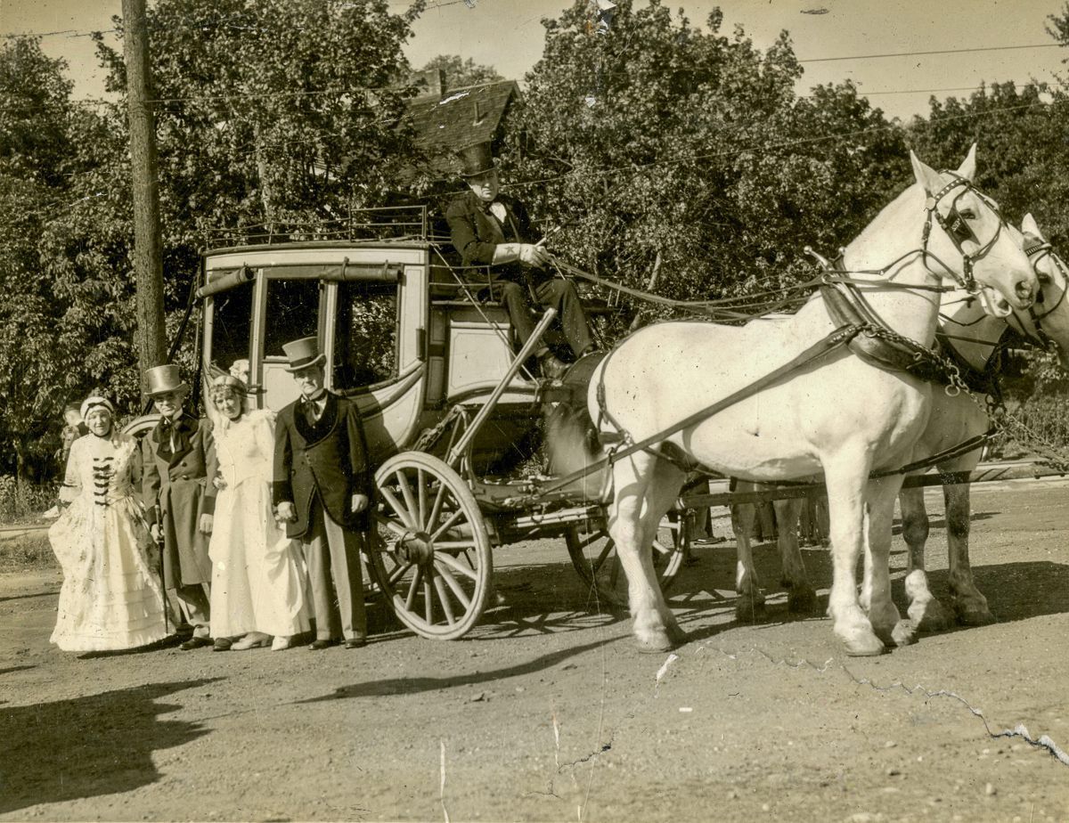 People in period costume posing in front of a two horse carriage taking part in a parade celebrating the Connecticut Tercentenary.Collection