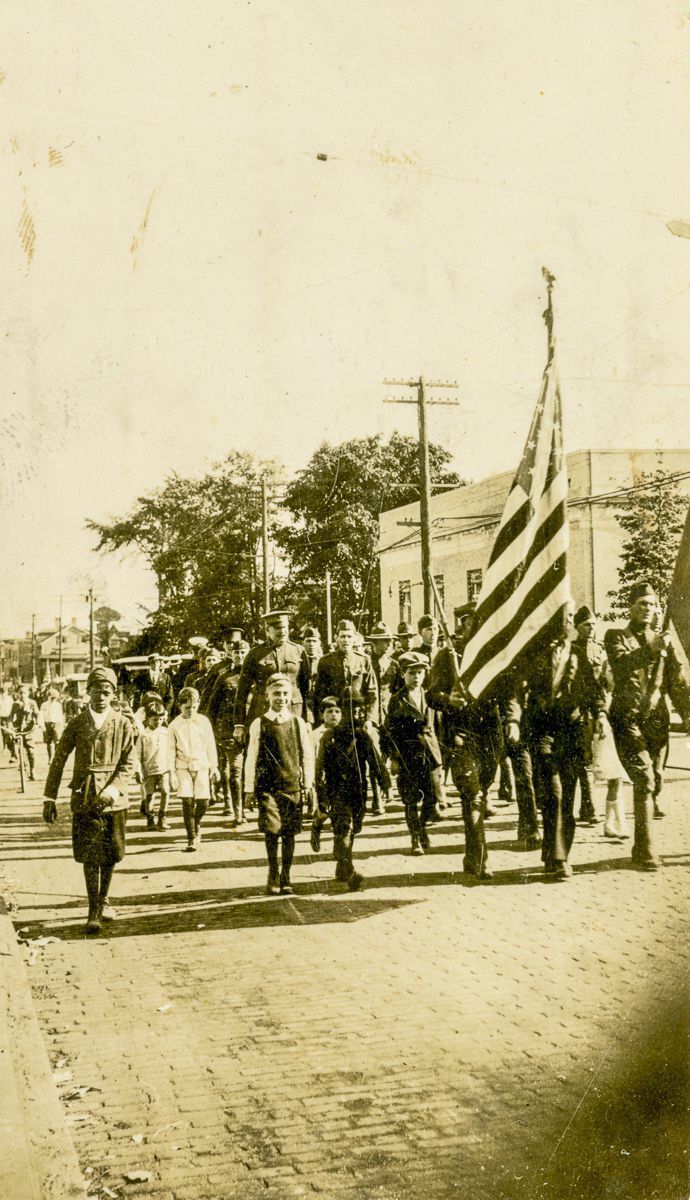 Children marching with soldiers in a parade on Greenwich Avenue in front of the former Post Office building.Collection