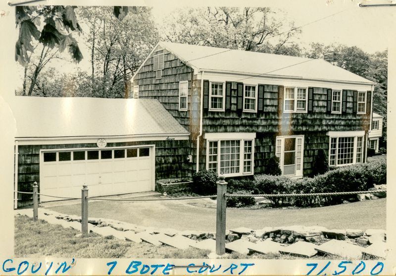 Two story shingled house with attached garage built in 1959 viewed from the street.