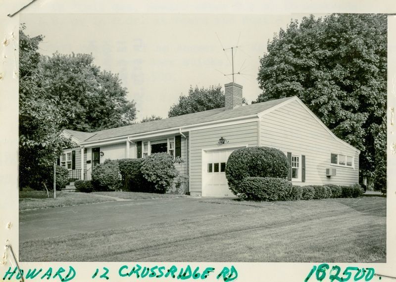Ranch house built in 1953 with a saltbox-style roofline viewed from its lawn.