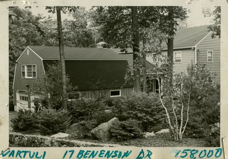 Two story house with a large garage with a gambrel roof in the foreground viewed from its driveway.Collection
