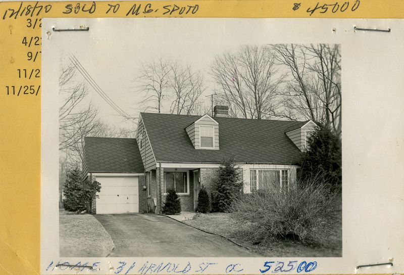 Two story brick and clapboard house built around 1950 with two small dormers and an attached garage viewed from the street.Collection