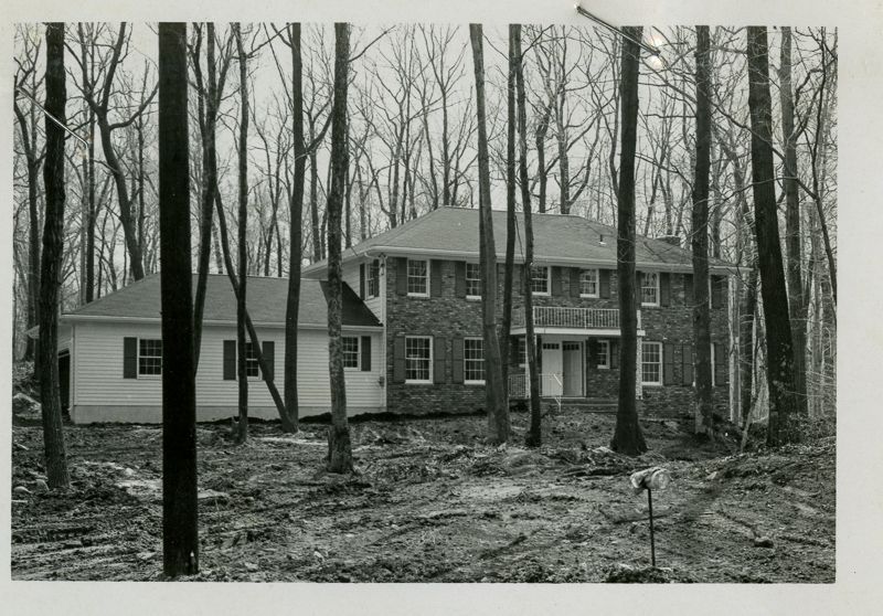 Two story brick house with a single story clapboard addition viewed from the woods surrounding the house.Collection