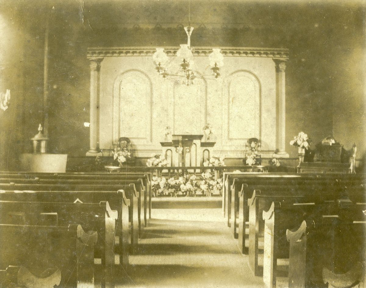 The interior of the First Church of Round Hill, looking towards the pulpit which is decorated with flowers.Collection