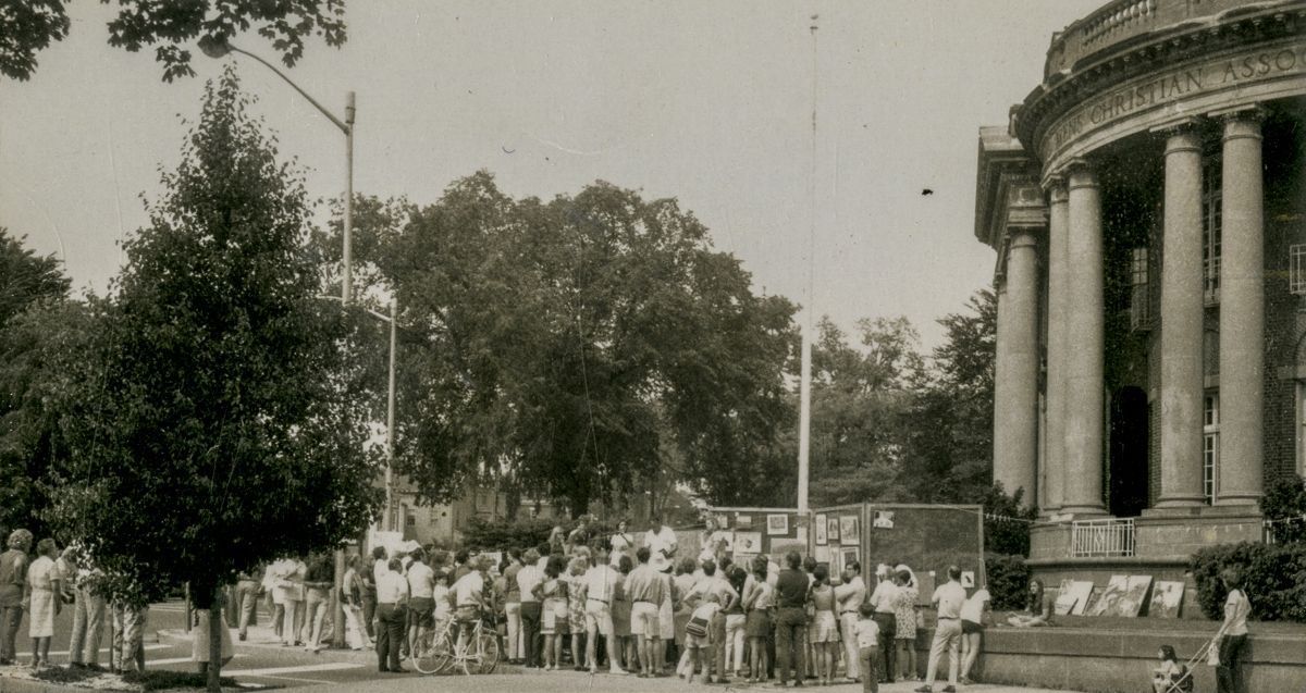 A group of people looking at art being displayed during a Sidewalk Show in front of the YMCA.