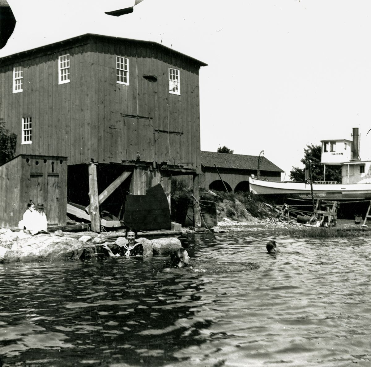 People swimming in Cos Cob Harbor near Palmer and Duff's (a boat-builder's on Palmer Point) workshop, outhouse, and chandlery.Collection