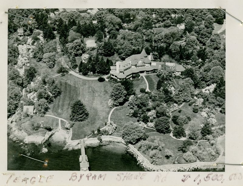 Aerial view of a Victorian mansion built in 1900 and its grounds and dock that stretches into Long Island Sound.Collection