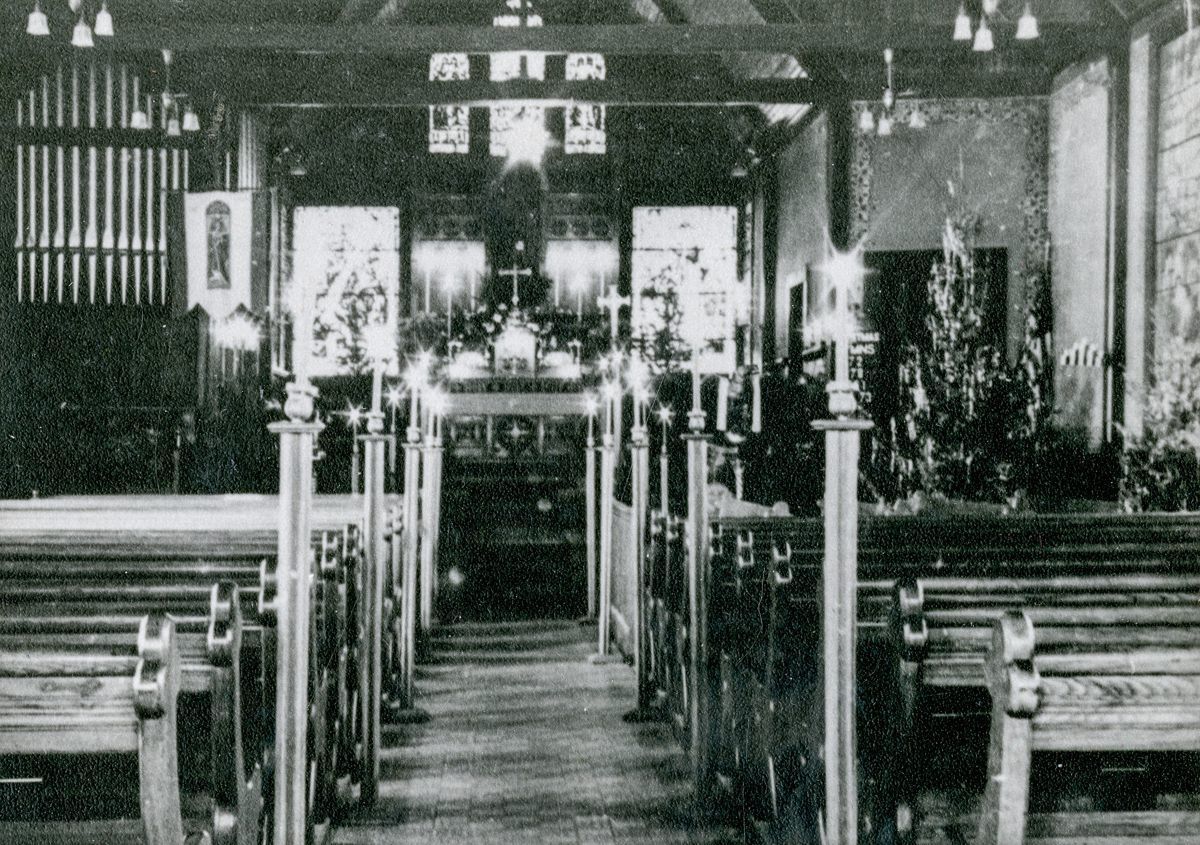 Interior of the original building of Saint Paul's Episcopal Church, decorated for the Christmas season, looking towards the altar.Collection