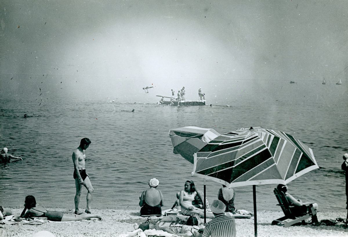 View from a beach, where a number of people are sunbathing, towards a floating swimming platform that people are diving off of; three small boats are visible on the right side of the image.Collection
