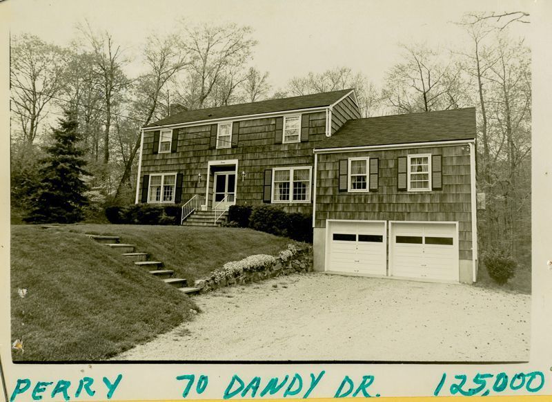 Colonial-style house built in 1966 with shingle siding and a two door garage viewed from its driveway.
