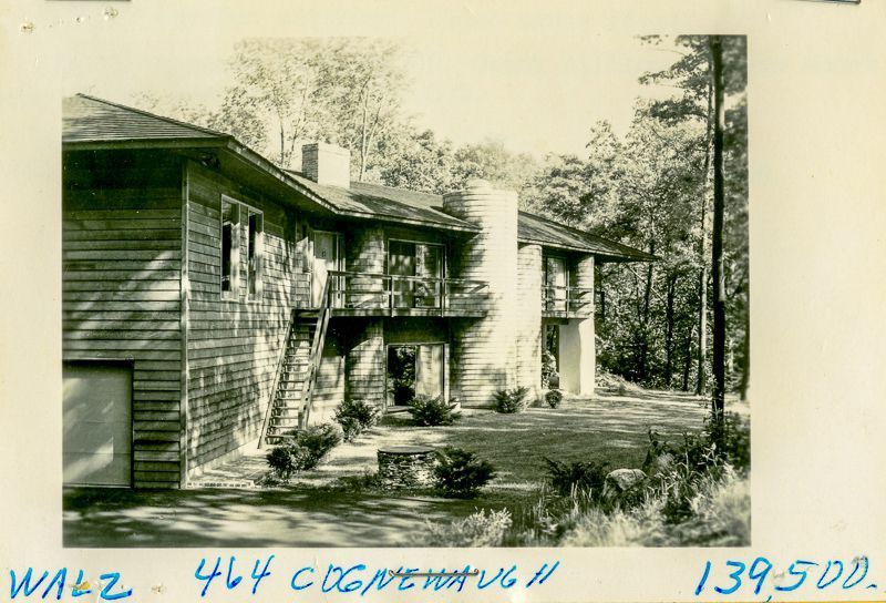 Contemporary house built in 1968 with redwood siding and a second story entrance/balcony viewed from its driveway.Collection