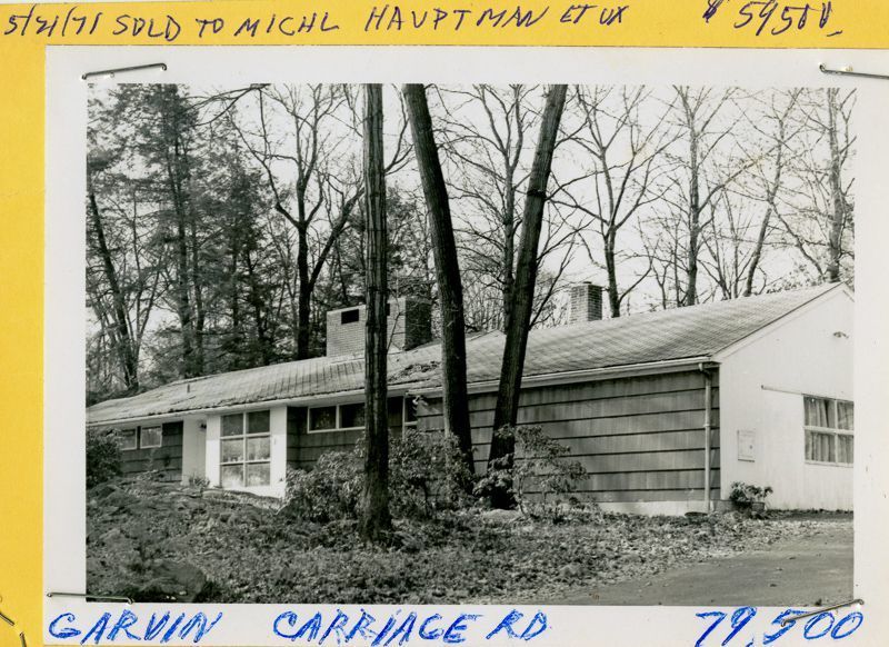 Ranch house built in 1957 with shingle siding viewed from its driveway.
