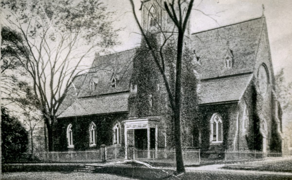 View of the original Christ Church, built in 1856, partially covered in ivy.
