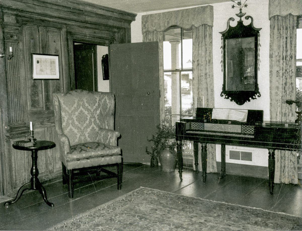 The parlor of the Bush-Holley House with a piano against the wall with two windows.Collection