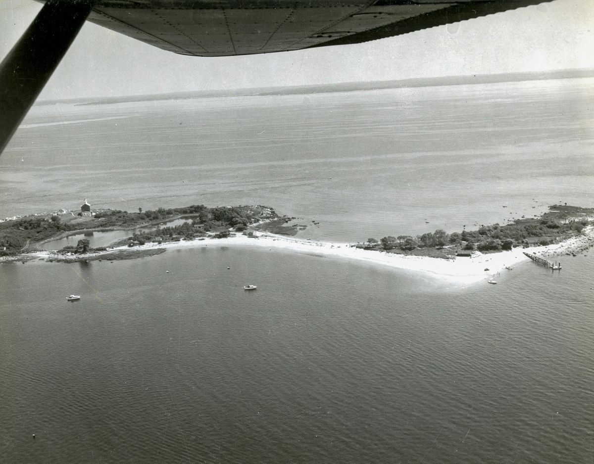 Aerial view of Great Captain Island facing south, Great Captain Island Lighthouse is visible on the left side of the image.Collection