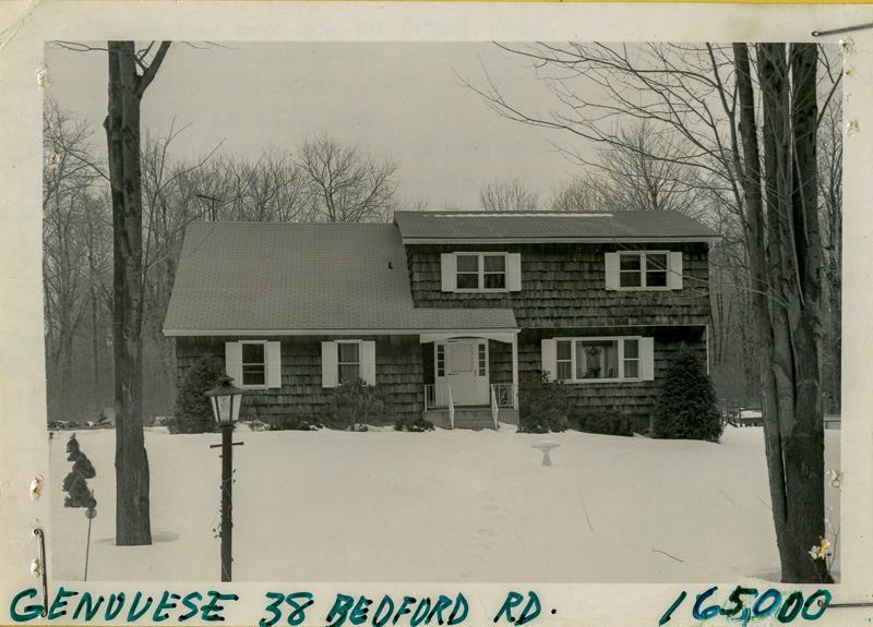 A shingled, colonial-style house built in 1970 viewed from its snow-covered lawn.
