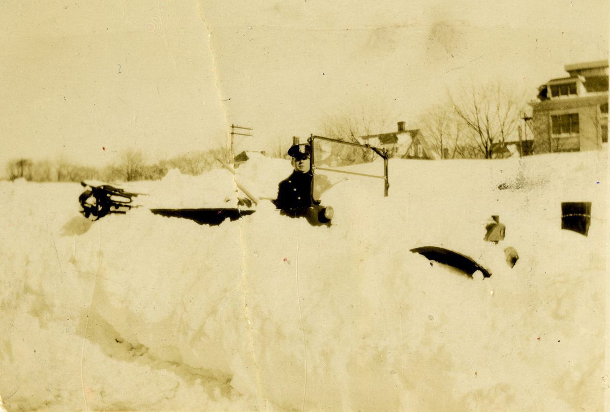 Police Officer Carl Johnson standing with a snow shovel, sitting in a snow-filled car that he has dug out.Collection