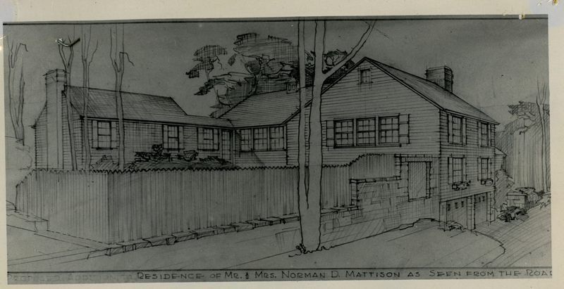 Drawing of a three story house labeled as being over 200 years old, with a two door garage and a fence around its yard viewed from the street.Collection