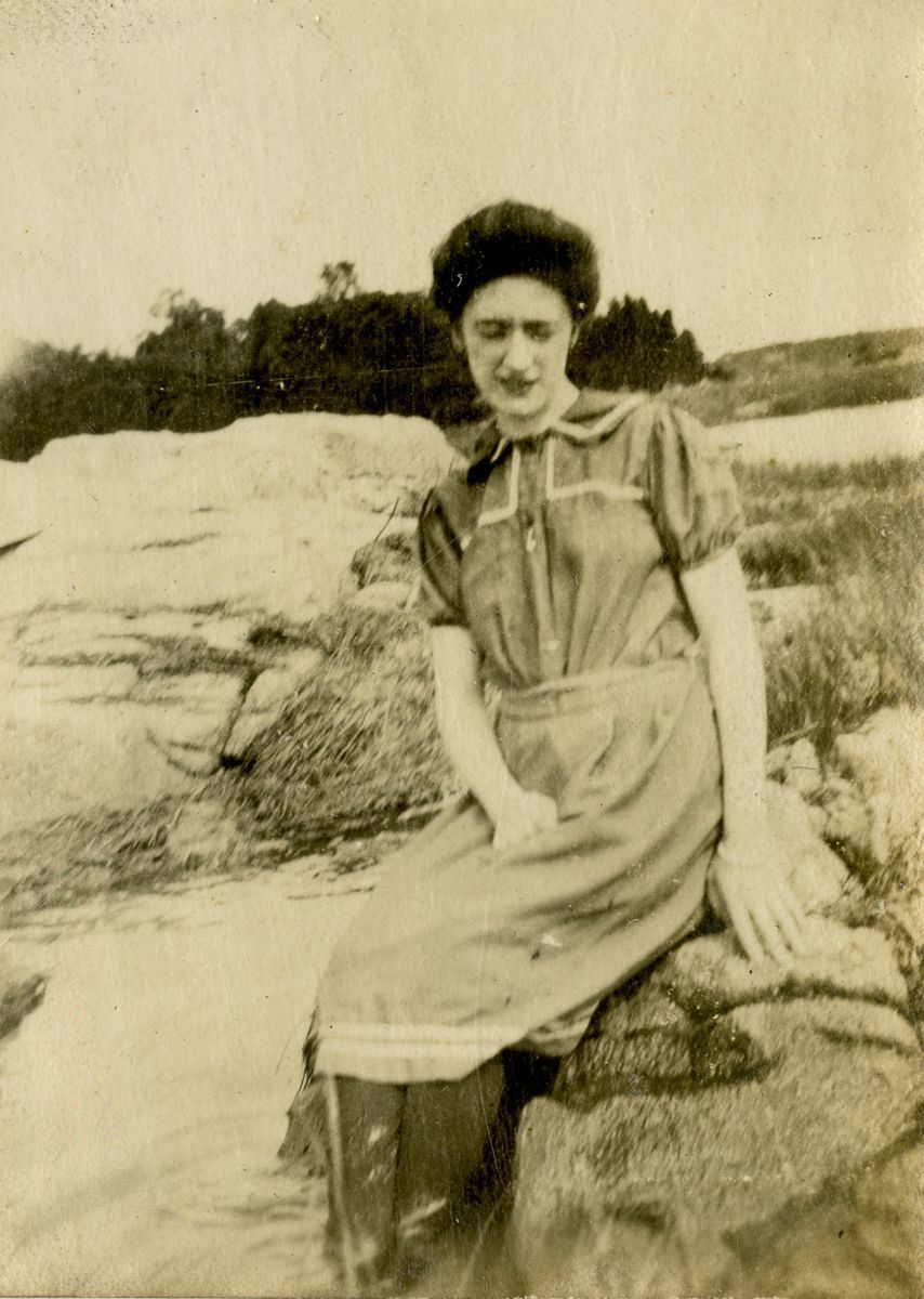 A woman in Edwardian swimming costume and a Gibson-girl hairstyle, sitting on a rock at the beach.