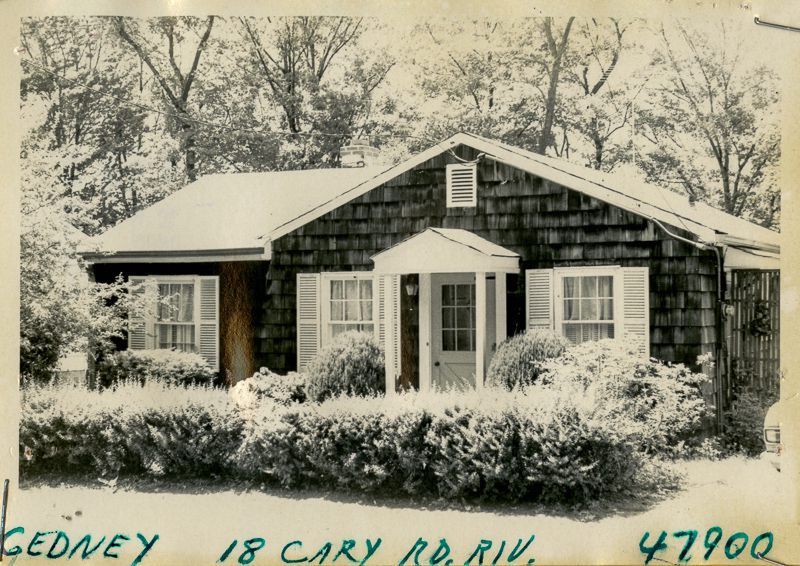 Ranch house built in 1946 with an addition from 1964 with shingle siding viewed from its front lawn.