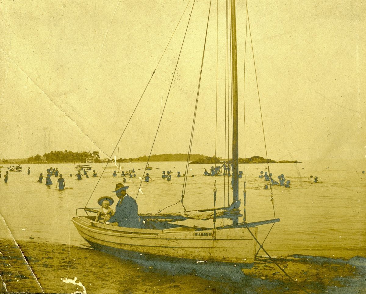 A man named on the back of the image as "Papa Joe" and a young boy named as "Jack" sitting on a sailboat that is pulled up onto sure at Oakland Beach.Collection