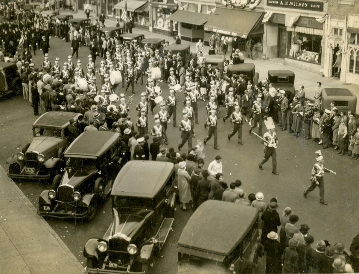 A marching band in the Tercentenary Parade on Greenwich Avenue.