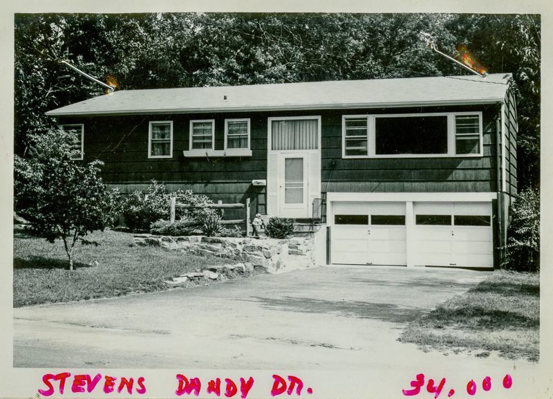 Ranch house built in 1956 with a two door garage viewed from the street.
