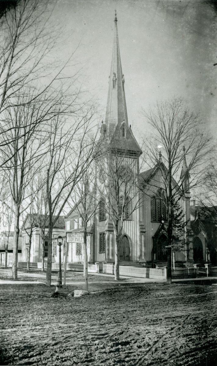 A view of the front of the First United Methodist Church; an ad for "M. Merritt & Son Livery Stable" can be seen by the sidewalk in front of the church.Collection