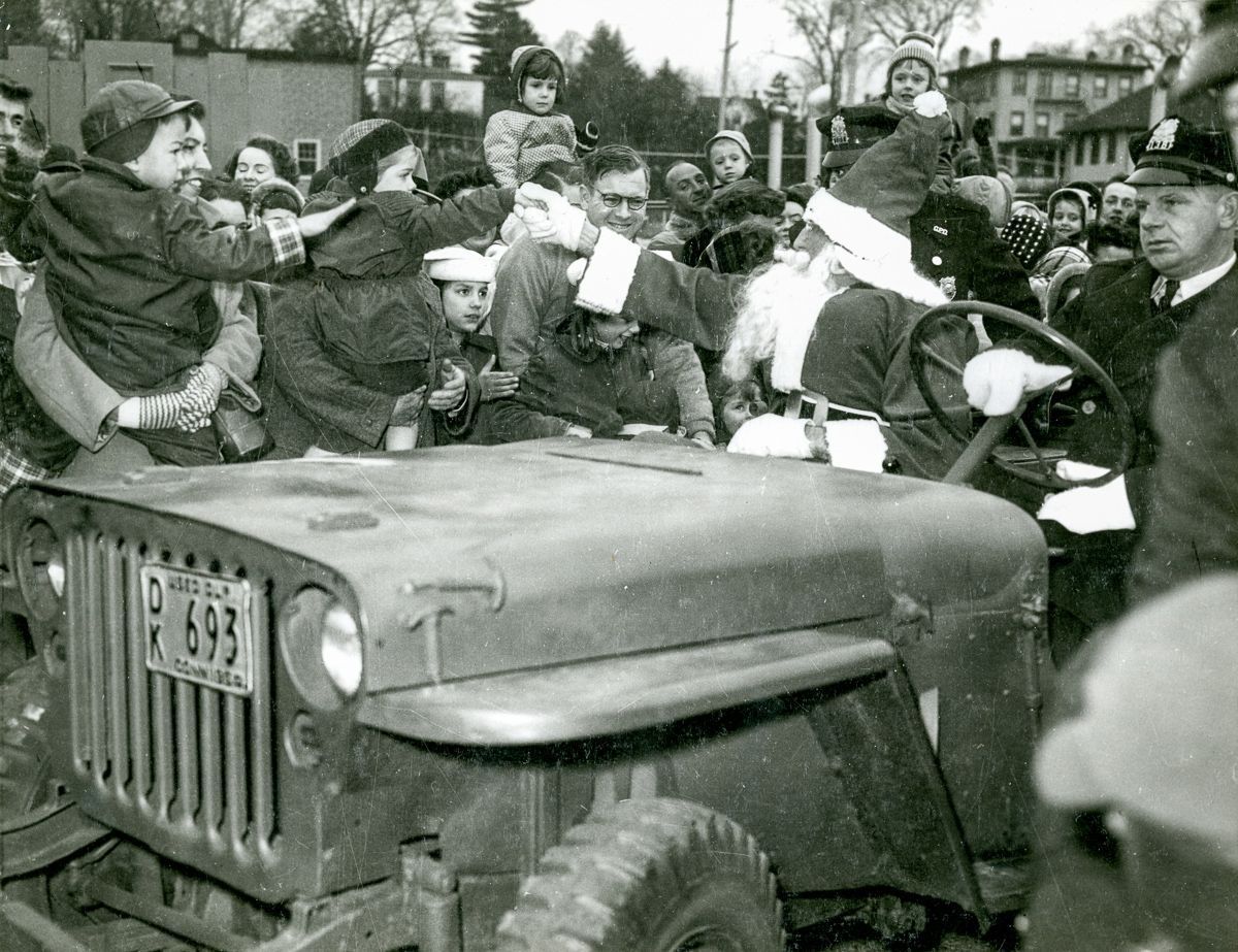 Bertha Boles dressed up as Santa Claus riding in a jeep greeting children.