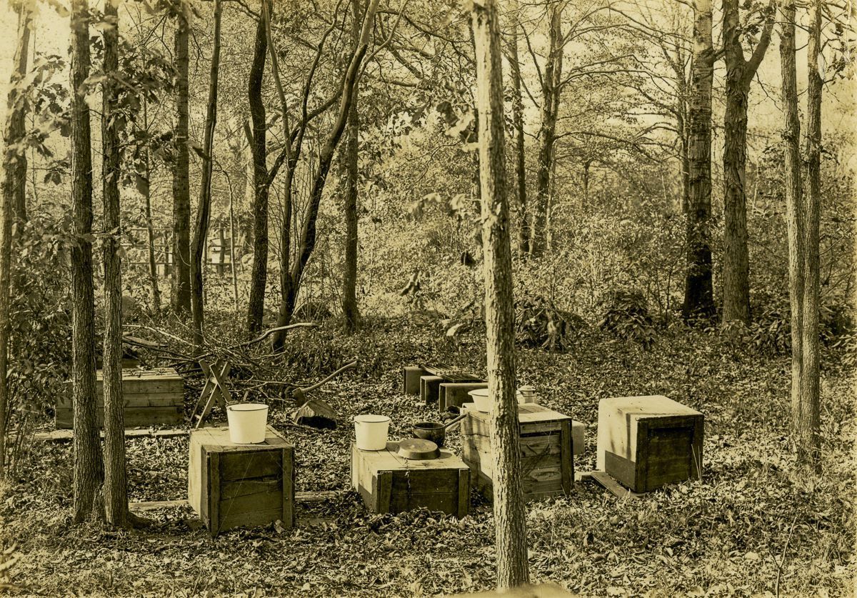 A grill and crated being used as tables and seating in the woods of the Agassiz Association's compound.Collection