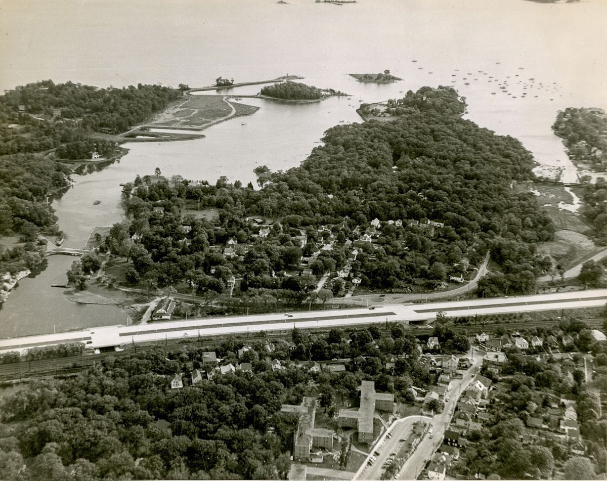 Aerial view looking south towards Indian Harbor Point with Interstate 95 in the foreground.