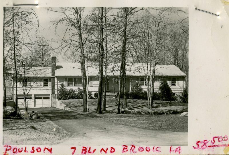 Ranch house built in 1962 with a two door garage viewed from the street.